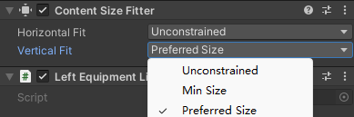 顾名思义这个组件用于调整整个对象的大小, Unconstrained 就是默认不改变大小, Preferred Size 能让容器自动适应尺寸,考虑子元素的 Preferred Width/Height ,也是最常用的功能, Min Size 也是让容器自动适应尺寸,但只考虑子元素的 Min Width/Height ,使用情况较少,但是遇到需要缩小/折叠的窗口或者想要保证某些元素有最小可点击区域时可以采用这个。