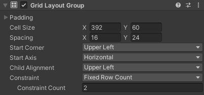 Grid Layout Group 和另外两种布局的区别比较大,在网格布局中每个子元素的大小都一致(这一点不受子元素上 LayoutElement 的影响),同时可以直接设置每一行/列的元素个数