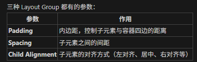 所以可以看出 Layout Group 分配空间的顺序:先保证元素的最小尺寸,如果有足够空间,给予元素期望尺寸,最后有多余空间时按比例扩展元素