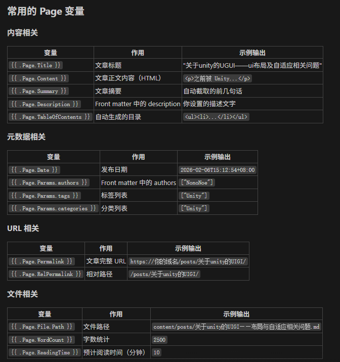 Hugo 模板系统提供了一些内置变量可直接使用,通常使用 {{}} 包裹